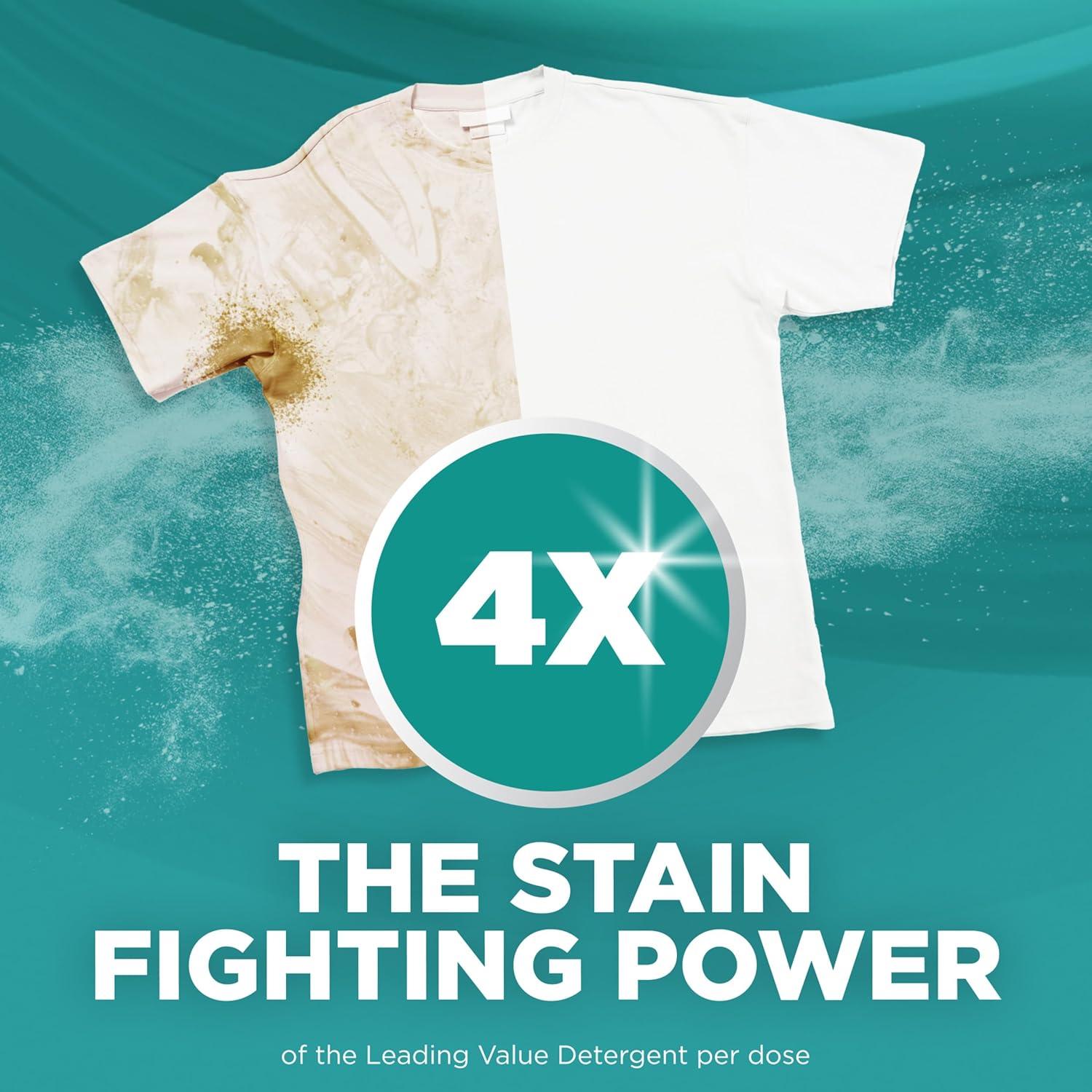 With 4X the stain fighters of the leading value detergent per dose; its pH Power Technology draws out stains between fibers and breaks them up at the source, for a deep clean in just one wash