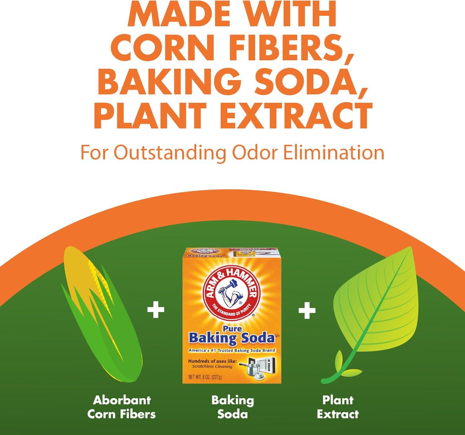 OUTSTANDING ODOR ELIMINATION WITH NATURAL INGREDIENTS. The power of ARM HAMMER Baking Soda + Corn + Plant extracts deliver superior odor control for multi-cat households. Natural clumping cat litter destroys the toughest kitty litter box odors