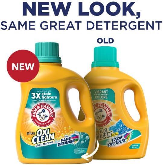 Help prevent fading to keep clothes looking newer longer with ARM & HAMMER Plus OxiClean with Fade Defense Liquid Laundry Detergent. This detergent is concentrated with 3X powerful stain fighters in every load versus the leading value detergent. It helps keep your whites vibrant and colors bright with Fade Defense technology, combined with ARM & HAMMER freshness and supercharged with OxiClean stain fighters! With the 5-in-1 power of a stain fighter, deep cleaner, whitener, brightener, and lasting freshness all in one bottle, it powers out microscopic stains and dirt to deliver a hygienic clean. Our advanced liquid laundry detergent is specially formulated to work in both standard washers and today's energy conscious High Efficiency (HE) models with a fantastic fresh scent that leaves your clothes with the clean fragrance of Sparkling Waters. It’s an ideal laundry detergent for darks and colors that delivers the concentrated washing detergent value and OxiClean stain-fighting power you deserve.