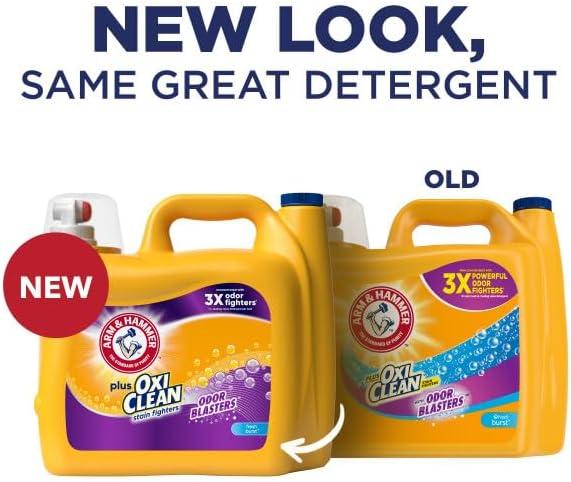 ARM & HAMMER Plus OxiClean with Odor Blasters Liquid Laundry Detergent is ideal for standard and High Efficiency (HE) washers. This concentrated laundry detergent boasts triple power: it fights tough odors, blasts away stains and boosts freshness. Concentrated with 3X powerful odor fighters in every load versus the leading value detergent, this HE detergent handles your toughest loads in all wash temperatures, even cold water. OxiClean Stain fighters and Odor Blasters power away stains and fight tough odors like body odor, sweat and musty towels. Infuse a long-lasting fresh burst when you use this laundry detergent and odor remover. Blended with trusted ARM & HAMMER Baking Soda, this laundry soap is tough on odors, dirt and stains, leaving clothes clean and smelling fresh.